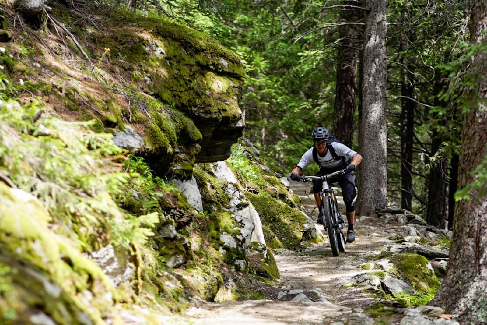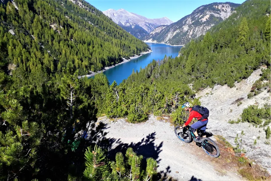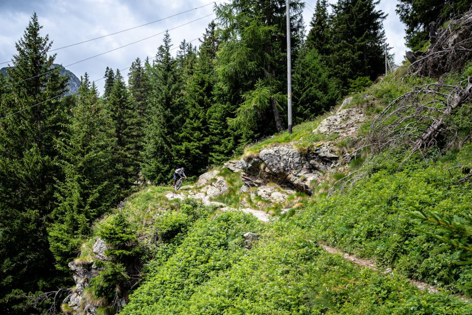 From the border pass, the real fun begins: an adrenaline-filled singletrack descent into Val di Camp. Before reaching Sfazù, we pass by the magical Lagh da Val Viola, nestled in a fairytale larch forest.