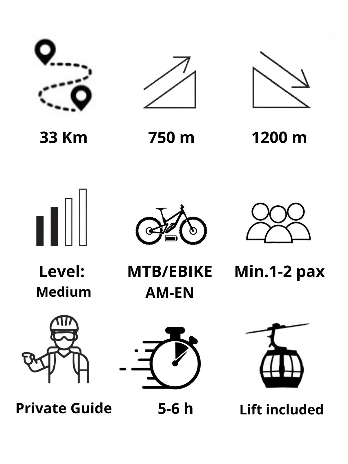We start with a gondola lift to Mottolino, followed by a short descent through the bike park, then continue down to Trepalle. From here, a beautiful trail climbs through the valley up to Passo del Foscagno. We then descend the opposite side, linking into a scenic rolling trail through the forest.